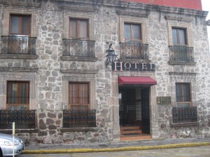 This is our first time traveling on a first class bus, the Parhikuni Line,and like everything else the Senor is never comfortable with the unknown.  I was told this bus was nicer than the plan we flew down on and that certainly was correct.  So far so good.  The seats are as comfortable as a Lazy Boy recliner, and just as roomy, if we spoke spanish we would have had a huge collection of movies to choose from.  It says you have internet connections, I didn’t try as the netbook was in the suitcase.  We brought some snacks for the 3 hr and 35 minute trip,nonstop. We brought our windbreakers with us as Morelia is about 6,000 ft elevation and the Butterfly Sanctuary is almost 10,000 ft so we knew it would be cold.  And we assumed it might be cold on the bus, but the tempature was comfortable the whole trip. We traveled through desert with large cactus growing everywhere,then we got into foot hills and farm country with orchards and lots of unidentified crops, some even looked like maybe grapes, then into the pine trees and at last Morelia. Once at the station in Morelia we bought our taxi ticket at a booth, gave the ticket and our hotel information to the taxi driver headed to our hotel, the Hotel El Carmen. At first site we were pleased with the hotel, it’s in a 17th century building, but it has been a bit rocky ever since we checked in.  My spanish is limited and of course they speak no English but we had reservations and were expected.  We asked about tours to the Butterfly Sanctuary and I believe that we are set up for tomorrow.  The Senor is a bit doubtful and as always is uncomfortable with the unknown, so I sure hope I’m right.  Next we head up stairs to our room. The hallways are lined with beautiful tiles, other walls are beautiful old stone. Our room is tiny, but we expected that, the surprise is the only windows in the room are a transome over the door and a big window in the bathroom that opens on to the hall.