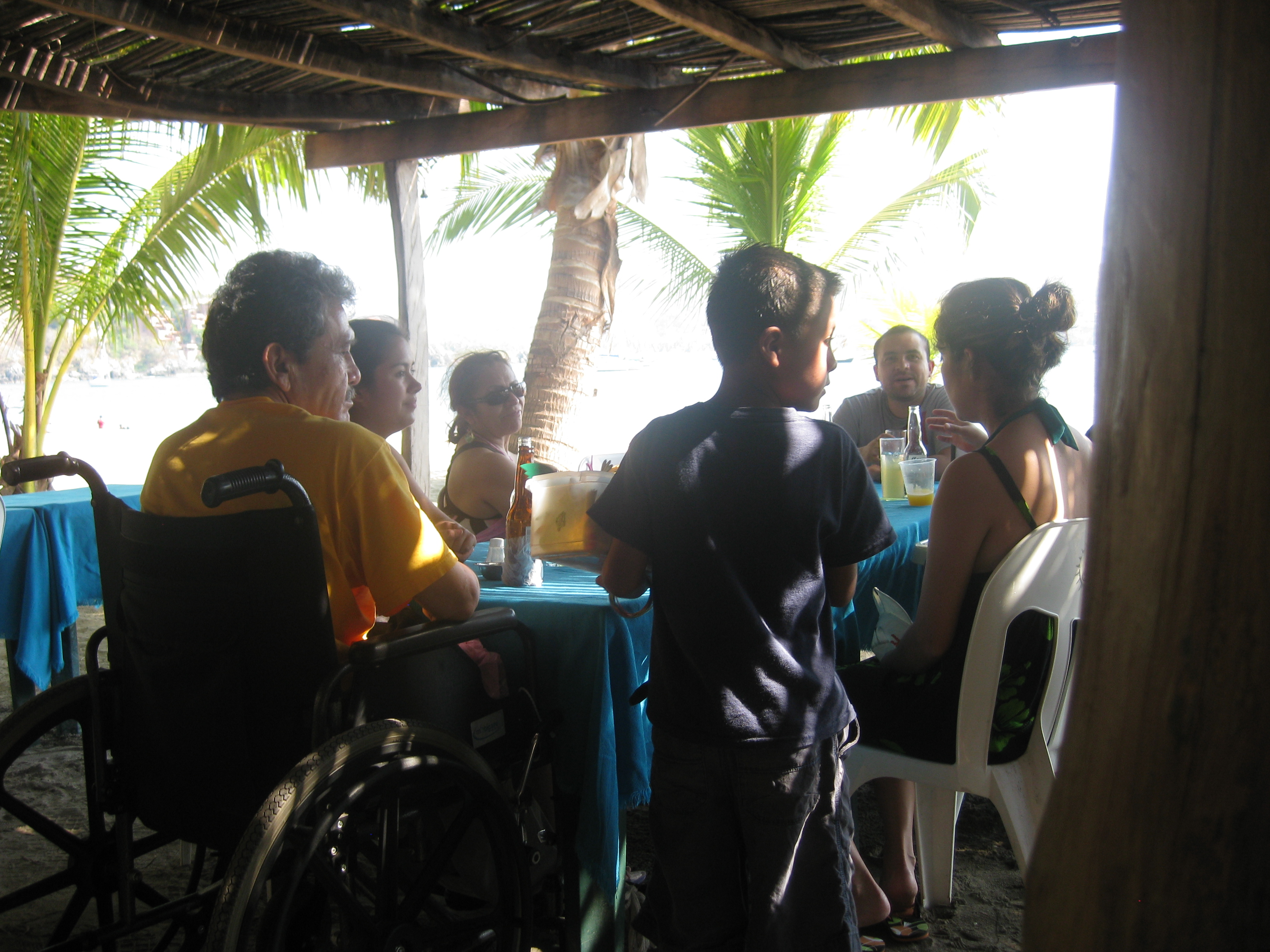 Pick up trucks with 10 -15 people in the back.  Small children standing up in the front seat of automobiles.  Buses being crowded and standing room only. Policemen riding the on the side of coke and beer delivery trucks with their rifles slung over their shoulder. Police pick-up trucks with automatic weapons mounted on top of the cab with a half-dozen rifle armed officers standing in the pack.  Military vehicles with the same armed presence, some times personnel is in full face mask driving through town.  Banks with long lines of people inside every day. 3 wheel bicycle deliver vehicles. Whole yellow chickens hanging by their feet in the Mercado, sides of beef being butchered in the open air with flies hovering.  Stalls with the most beautiful array of fruit and vegetables where it takes one person to weigh it, note the cost on a slip of paper for you to pay the cashier who sits right beside the weigher. Labor intensive! It takes 3-4 people to complete a sales transaction in the fabric store.  American brands with a twist; McCormick pepper has ground up lime in with the pepper.  Mayonnaise comes with lime in it.  Or you can get it chilli flavored. Eggs come loose in a plastic sack. Toddlers playing at the beach in their birthday suit.  Some are wonderful, some not so great, but viva la difference.  Signing off KO