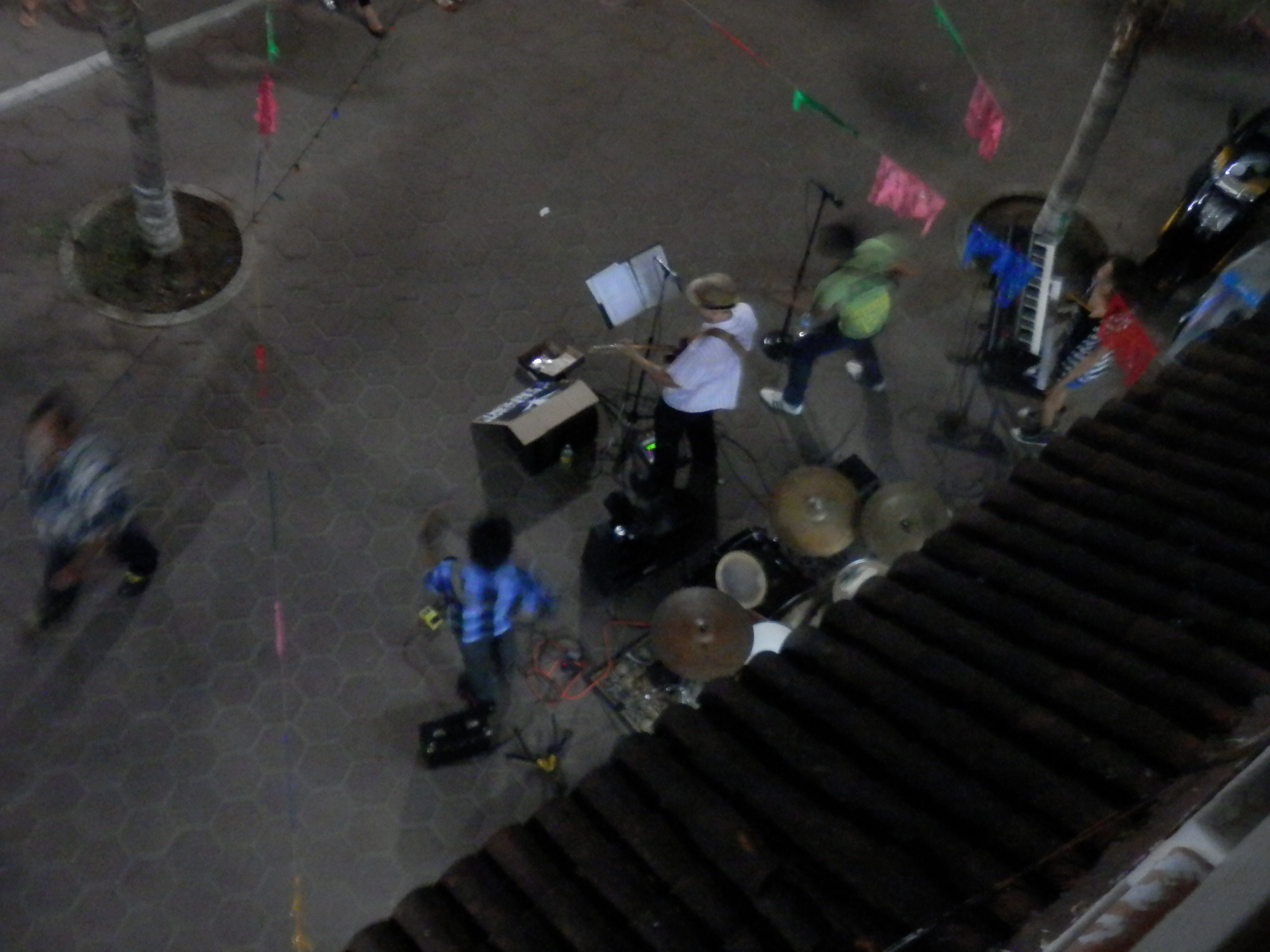 OLYMPUS DIGITAL CAMERA The young musicians were back last night in front of the art gallery, and the crowd began to form. Soon folks come forward one by one and to drop a tip in the kitty.  We have this wonderful birds eye view from our third floor balcony and as the crowd gets larger the band really draws the audience in by their talent,energy and large repertoire of great 60’s music, At first folks just sway to the beat of the music and it’s only the little kids who just can’t resist dancing.