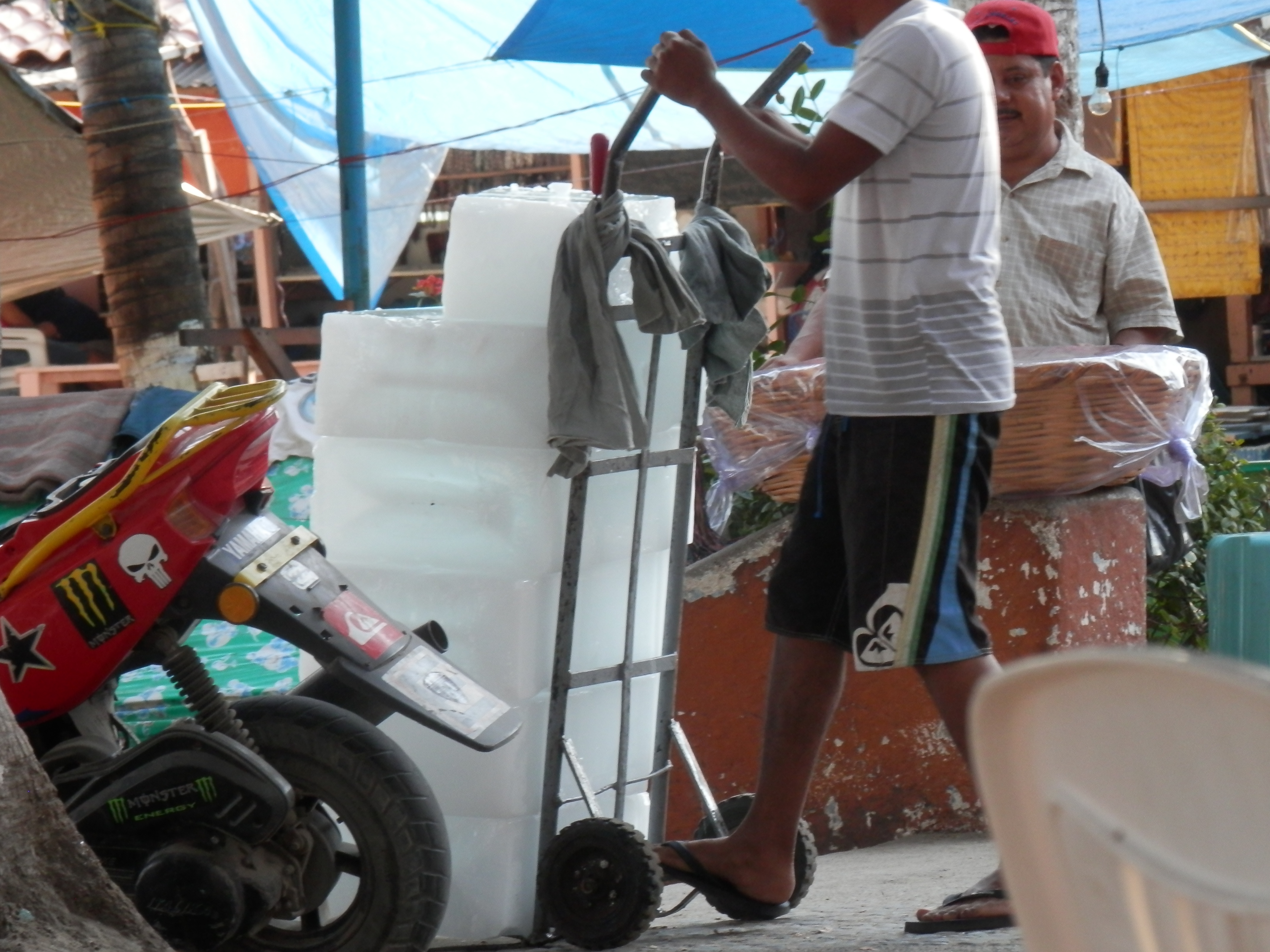 I enjoy sitting by the waterfront and watching life go by, visiting with friends and strangers. I’m fascinated with the work people do here as I watch the “the ice man commeth”. He makes trip after trip with huge blocks of ice on a trolley from where he parks a block away, and then shoulders these mammoth blocks of ice down the steps to the beach for the fishermen. This is in 89 degree heat.
