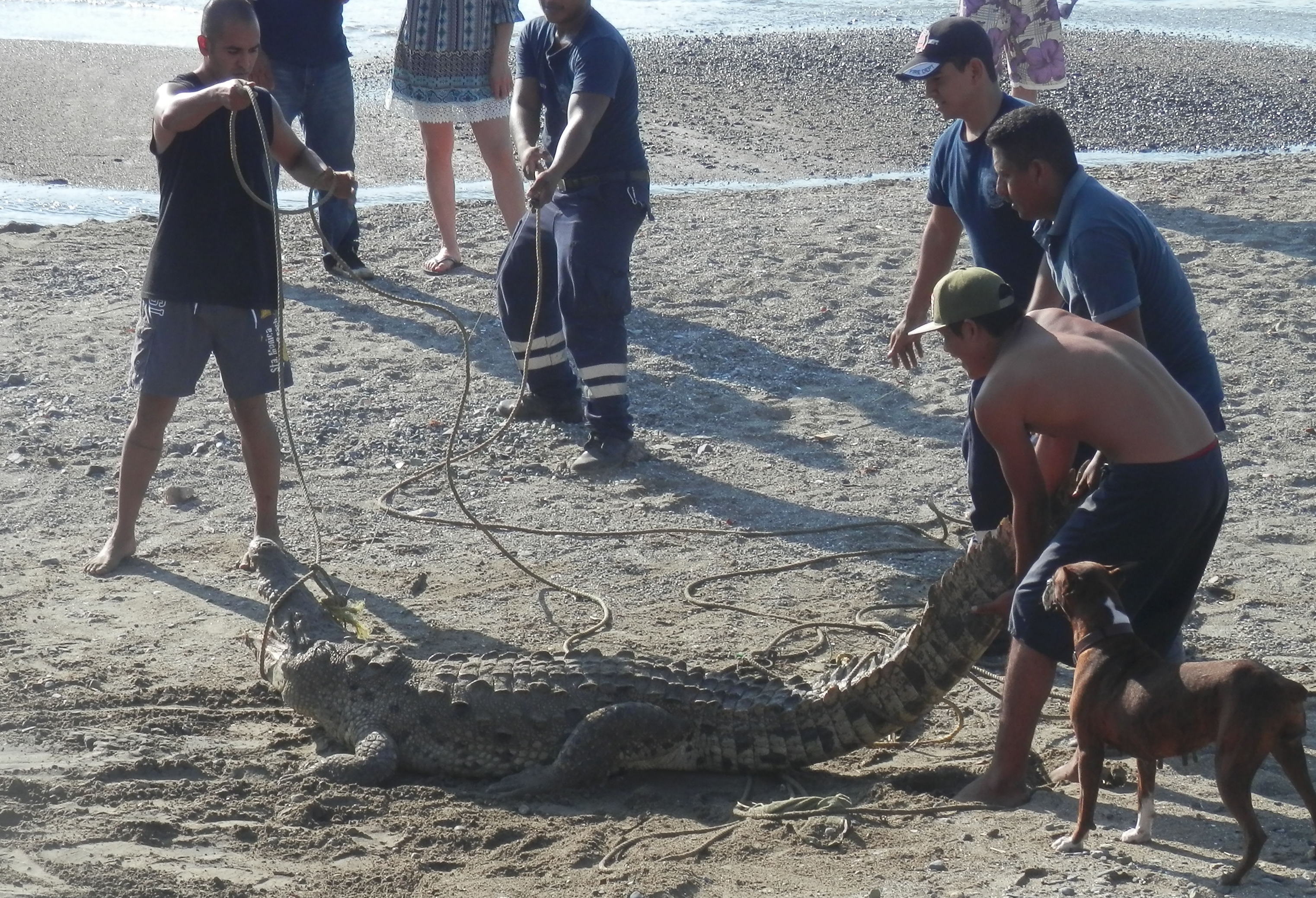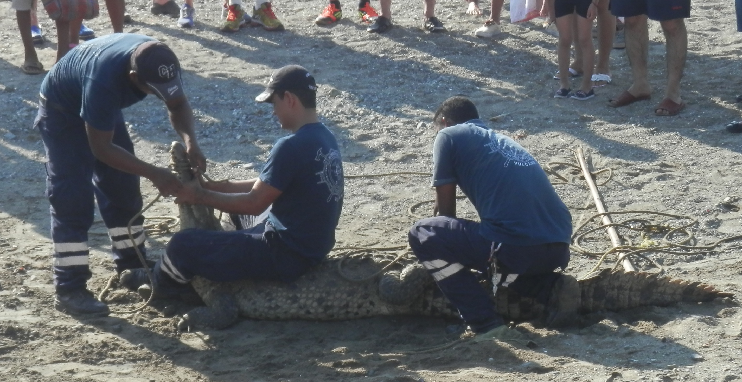 I was there for an good hour watching as the hunted him with ropes and grappling hooks in the water, finally getting him on land, but far from under control. They wrangled him for a good 20-30 minutes, loosing him once, gaining control again and making him roll over several times which seemed to be the way to get a rope around his snout tight. Then one climbed on his back, pulled the snout rope back bending the head way back and proceeded to get the more rope tight around his snout.Next they tied his feet over his back and at this point he was completely under control and the crowd walk around him some kids touched him and a very interested dog finally got to sniff him. One of the bomberos went for a truck to haul him away. What happens to him now I don’t know, I hope he doesn’t be come belts and steaks. Maybe I should check and see what’s barbecuing at the fire station. I do hope he just gets relocated. Many of the people here say you don’t need to do anything, he could have just been left alone and he would go back where he came from. I don’t know what is correct, or if they are endangered or protected species, or if they pose any danger to me as a swimmer. It’s a very popular beach where I swim so it can’t be dangerous.