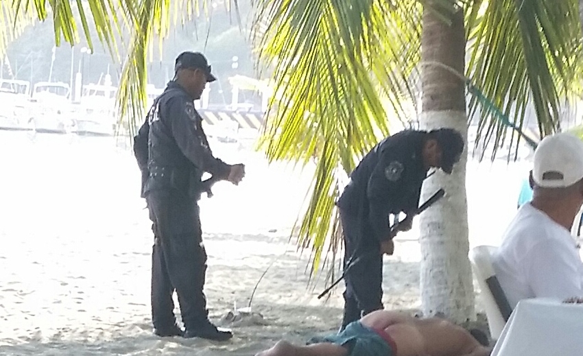 While selling T-shirts for Sailfest the other day I saw the police in action for the very first time. They have a huge presence here, but all I see them do is ride around it trucks in large groups. But this afternoon a fellow must have had too many and choose to sleep it off in the sand, unfortunately he fell asleep with his trunks at half mast, sunning or airing his buns in the sun. This seems to be frowned upon as the Policia arrived and woke him up and made him move on.