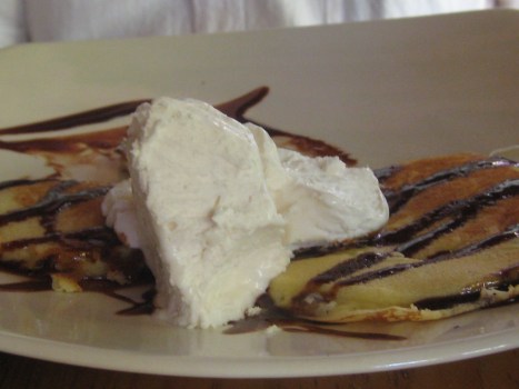 Strawberry crepe with chocolate syrup and frozen cool whip
