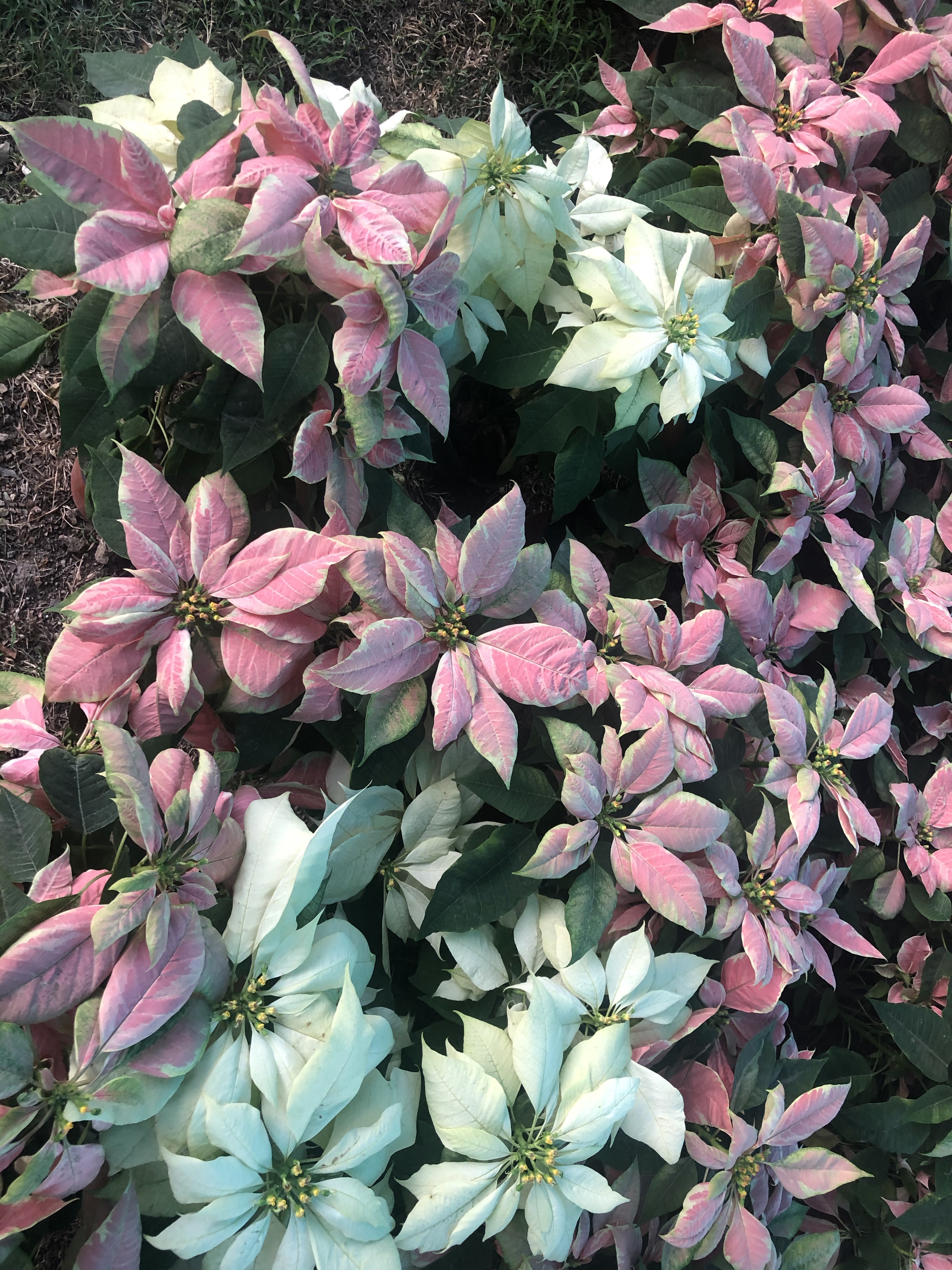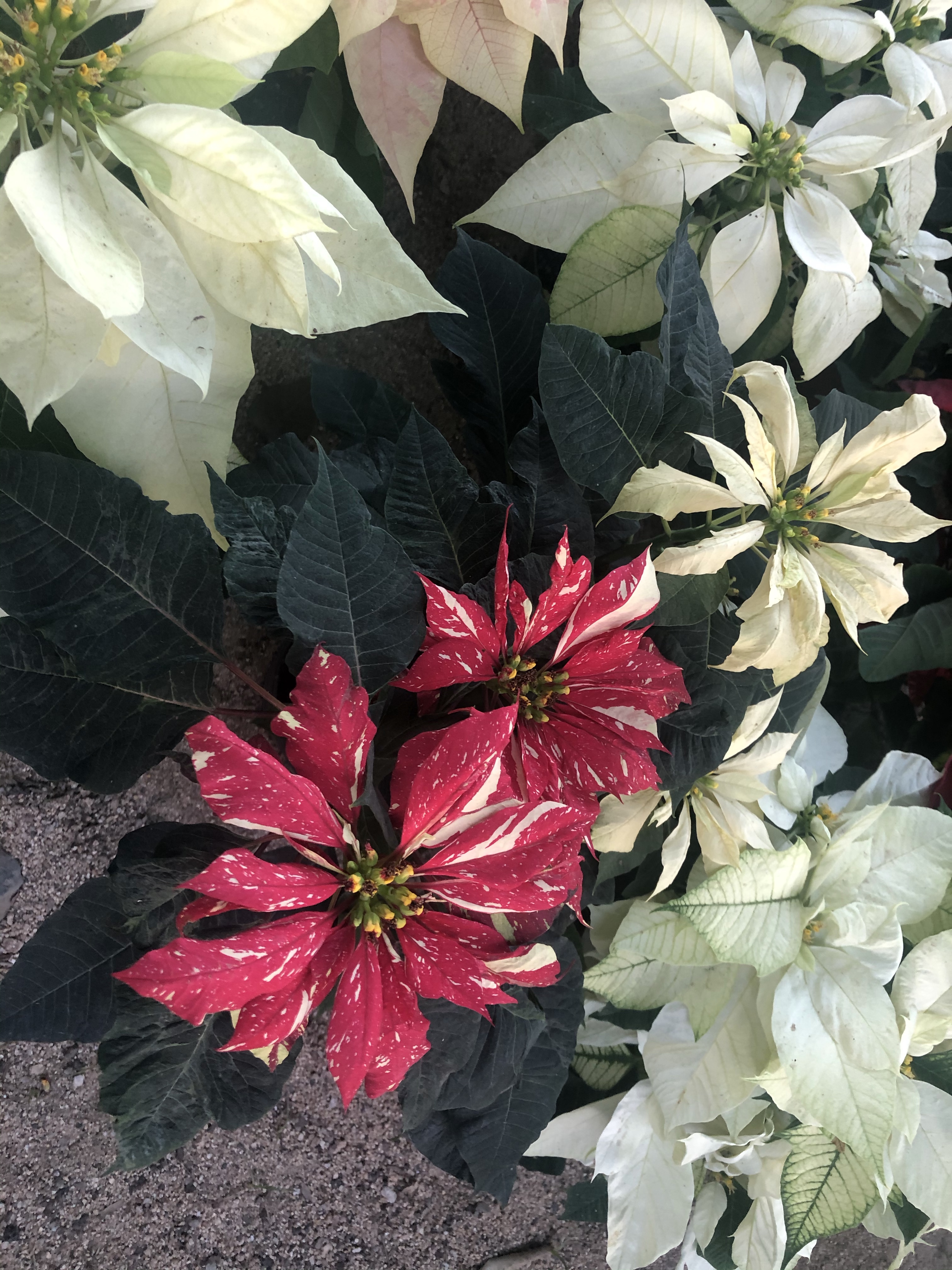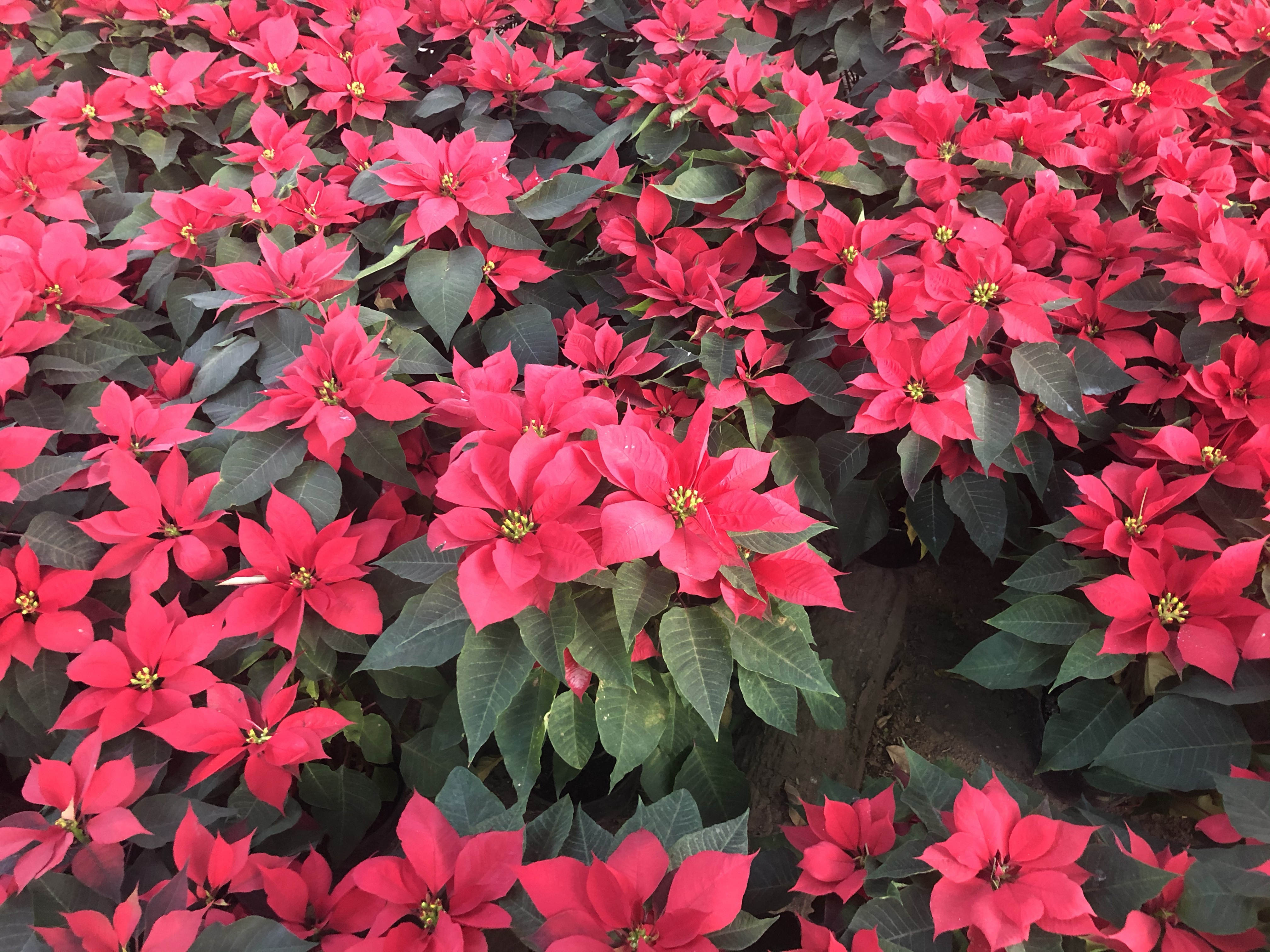 I crossed the street to the “field” of poinsettias, noting how they came in many colors, shades and mixtures. But I still prefer the true red.