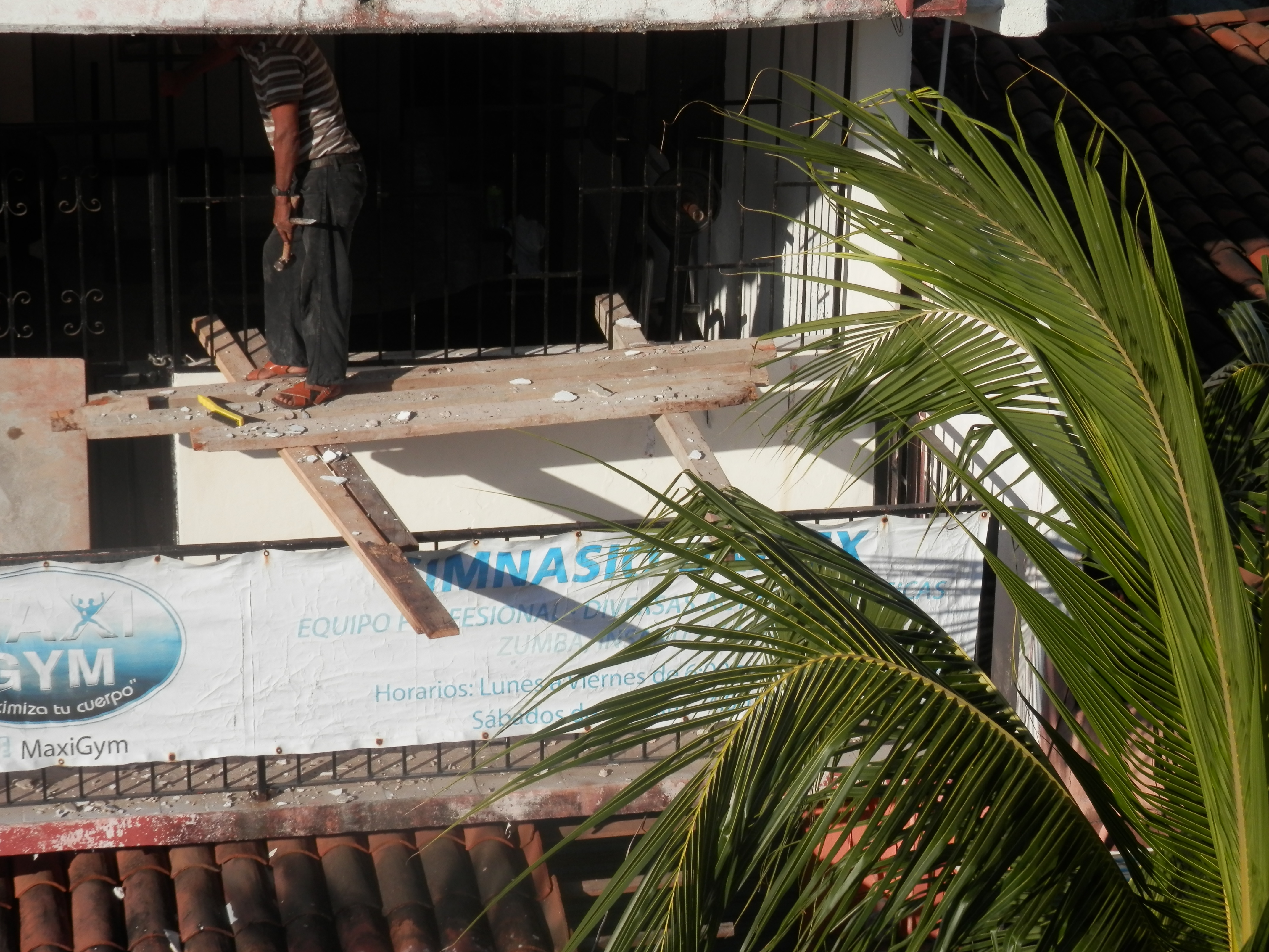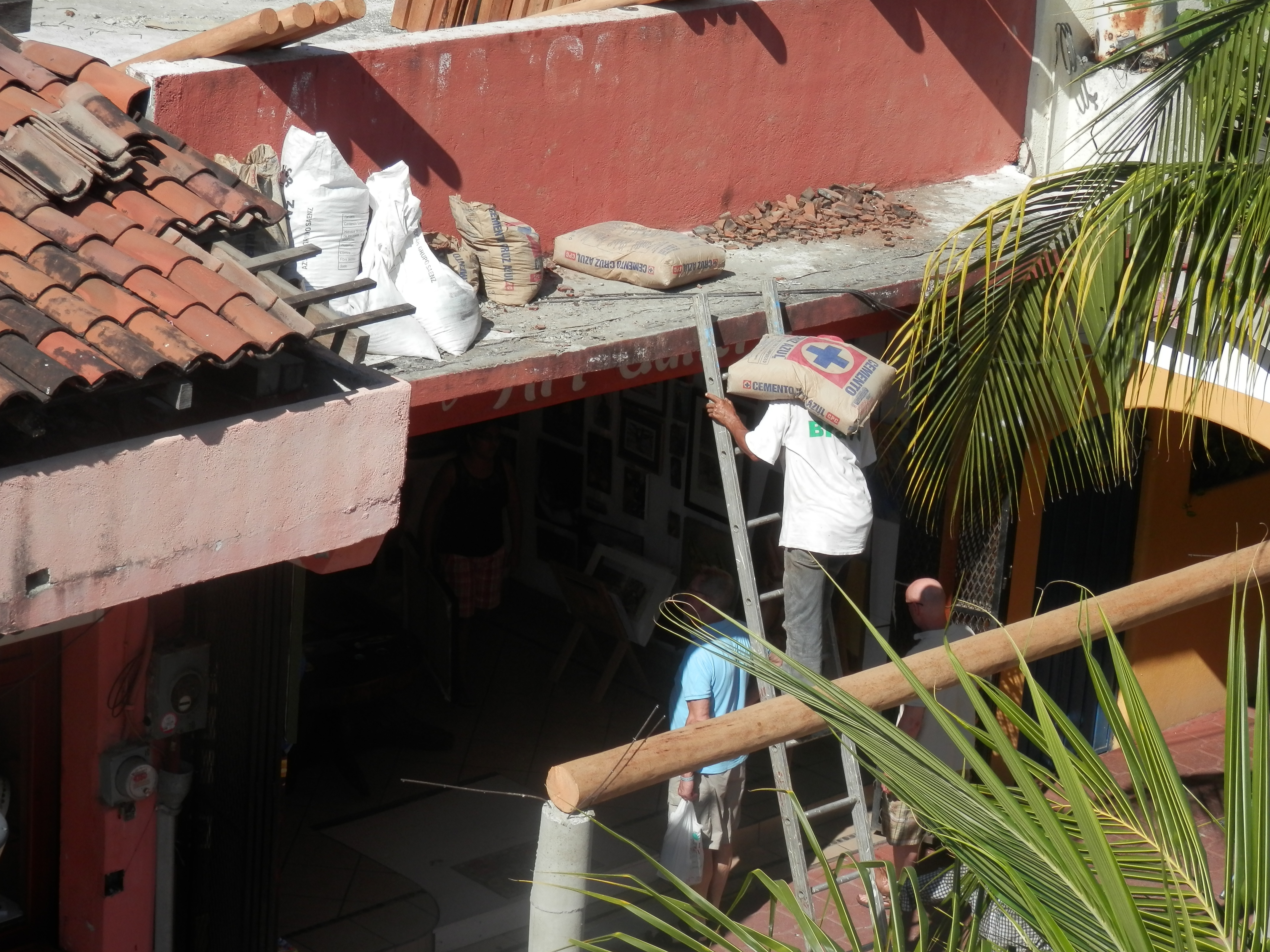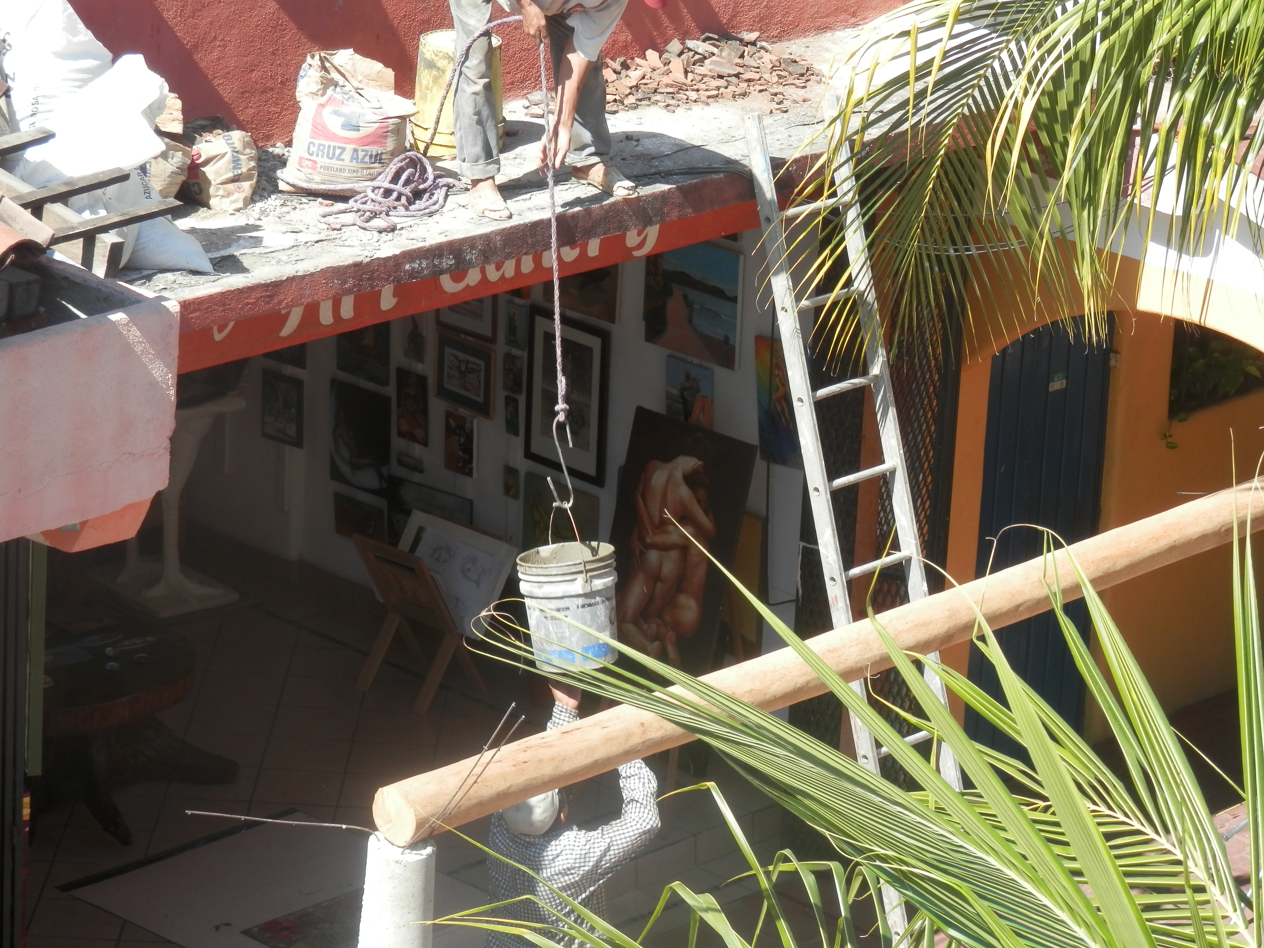 We have been watching with interest the removal and repair of the tile overhang on the side-walk across the street. Two of the buildings lost their overhang in last year’s good Friday earthquake, and the third just needed replacing. The Mexican people work very hard, and with little help from modern technology. This is a project of labor with only the barest of hand tools. I’m amazed and somewhat horrified at what is being used as scaffolding for the ensuring work, and the fact that the men work in “hurrachies “instead of steel toed boots while working with huge bags of cement, heavy tiles and timbers. The Senor groans every time he sees two men on a ladder, or coming down the ladder like a stair case. His years of working”hazmat” and being safety officer just have him shaking his head. They mix the cement on the flat roof of one of the buildings, then shovel it into a 5 gallon bucket, lower it by rope to the fellow below who then carries up the ladder to the top of the form for the supporting pillars, pours the contents in, goes down the ladder , throws the bucket up, to the man on the roof while getting the next bucket off the rope. All this is happening with pedestrians walking under this construction project and two children playing in front of their mothers shop. Absolutely fascinating, no TV for us today this is real life drama. Almost no power tools, the wood is notched with a machete, they work very hard through the heat of the day and are real craftsmen. I am so impressed but at the same time fear for their safety.