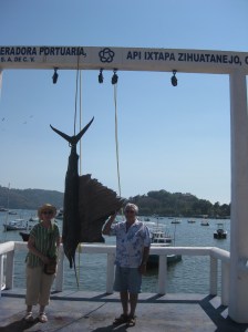 The Senor went fishing on the Dos Amigos today and about 14 miles out caught this big one. Of course he didn’t have the camera with him and I had opted not to go so there is no record of the fight and landing this approximately 100 lb fish. He just gave the fish to the captain as a sail fish isn’t what he considers to be good eating, but. Luckily I met up with him and was able to get some good pictures. Obviously he is very proud of his catch. While he fished I prowled around town, did a little bit of shopping, but mostly the looking kind of shopping. Then I took myself out to lunch. I selected one of the waterfront restaurants where you can sit at a table with your feet in the sand. Lunch would have been cheap except for the two mango margaritas. Which I have discovered are the absolutely the yummiest drink ever.