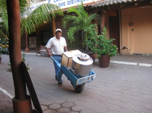 The “Good Humor” truck has a different look here also and defiantly a different sound. No Calliope type music just the soft tooting of a bicycle horn as he pushes his cart around town. Today this one had 2 flavors in his galvanized tub, coconut and strawberry. I opted for the strawberry today. We were sitting at Zorro’s Bar which is almost right under us, I didn’t even need to get off my bar stool to trade 20 pesos for some great tasting, probably home-made ice cream.