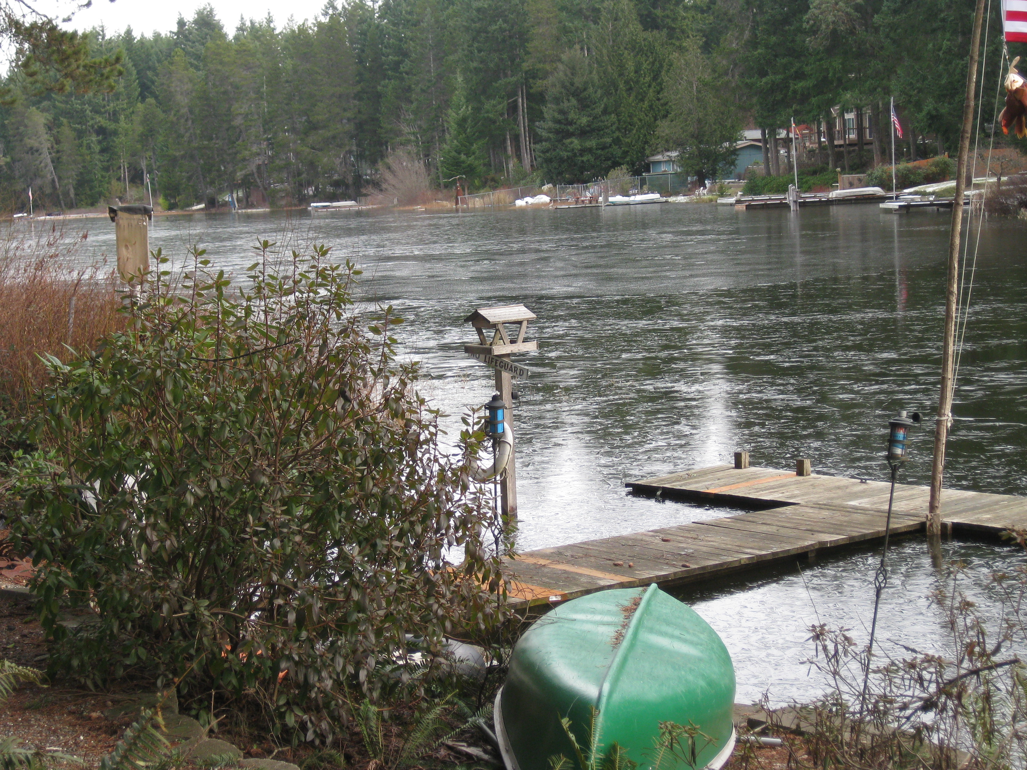 Started snowing last night, woke up this morning to no power and rain washing the snow away. As we got sevral inches of snow last night it will be incredible messey while the snow gets washed away. Just more signs it’s our time to leave Washington for a warmer climate even if only for a month. This will be my parctice down load, my first attempt at posting a picture. Here is our lovely lake all frozen over taken yesterday morning. Signing off KO