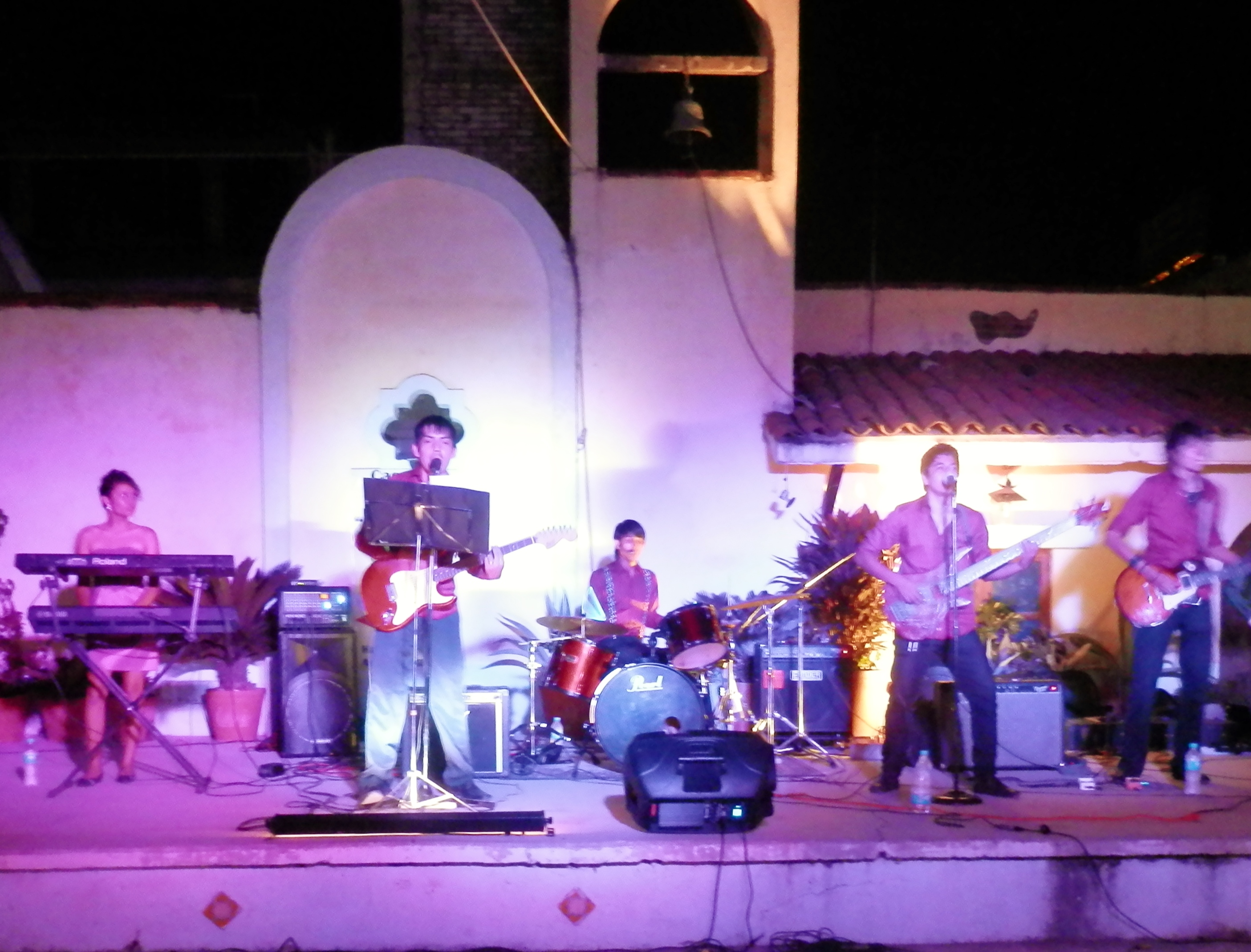 At most concerts the warm up band is a new up and coming group. Last night it was the reverse, the “old guys” opened for the up and coming band. The Mike and Andy Show played some rock and roll and some folk music and had the crowed warmed up nicely for Expressions Inmune. Expressions Inmune consists of 5 local youth ranging in age from 16 – 26. They dressed in matching mauve satiny shirts with the one very pretty Senorita in a dress of the same color. They looked very professional and wowed the crowd with their skill and enthusiasm belting out all the old
