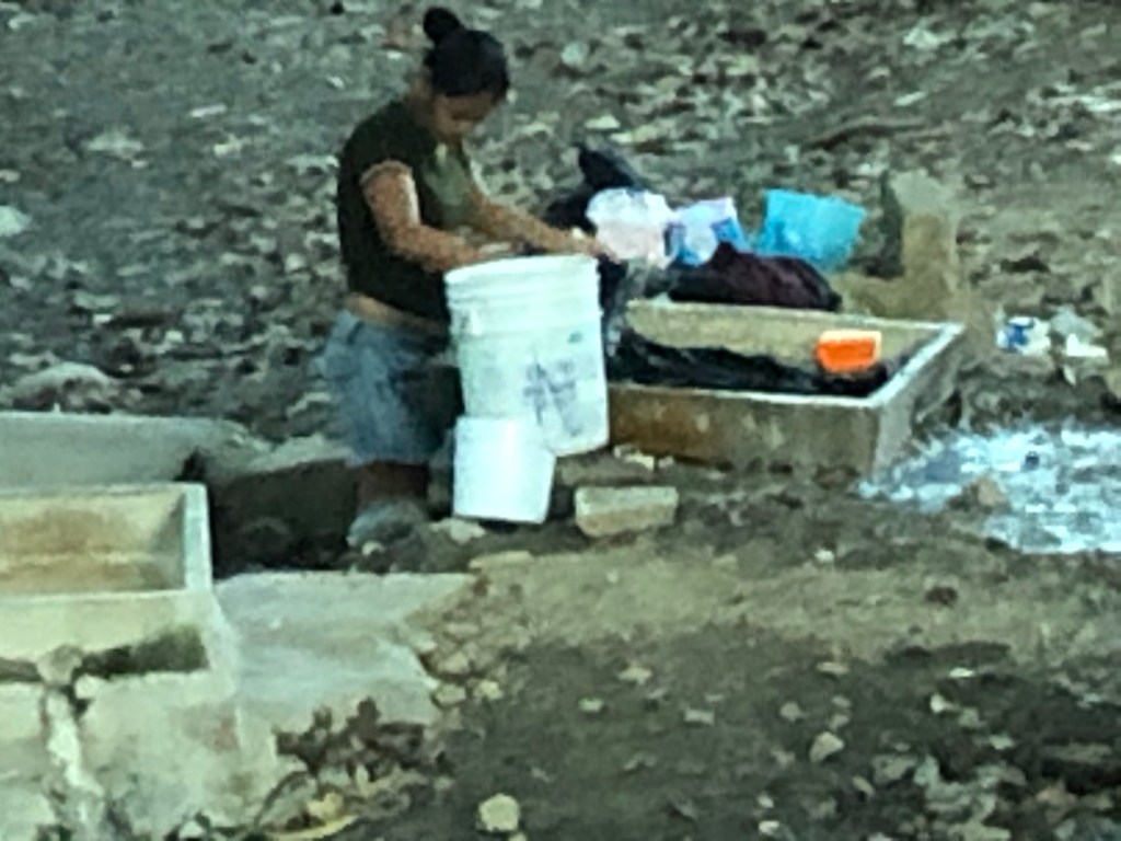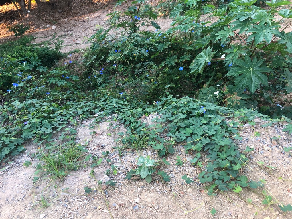 That was the last time we knew where we were until we spotted the new high school high on the hill overlooking the highway. Along the way we walked through Mexican neighborhoods where we were not only the only gringos, but the only ones using masks, watched a young lady doing her wash on a stone in a trickle of a creek. Saw a beautiful spread of purple and white morning glories but soon we were in a tunnel and going under the highway and approaching “THE HILL”.