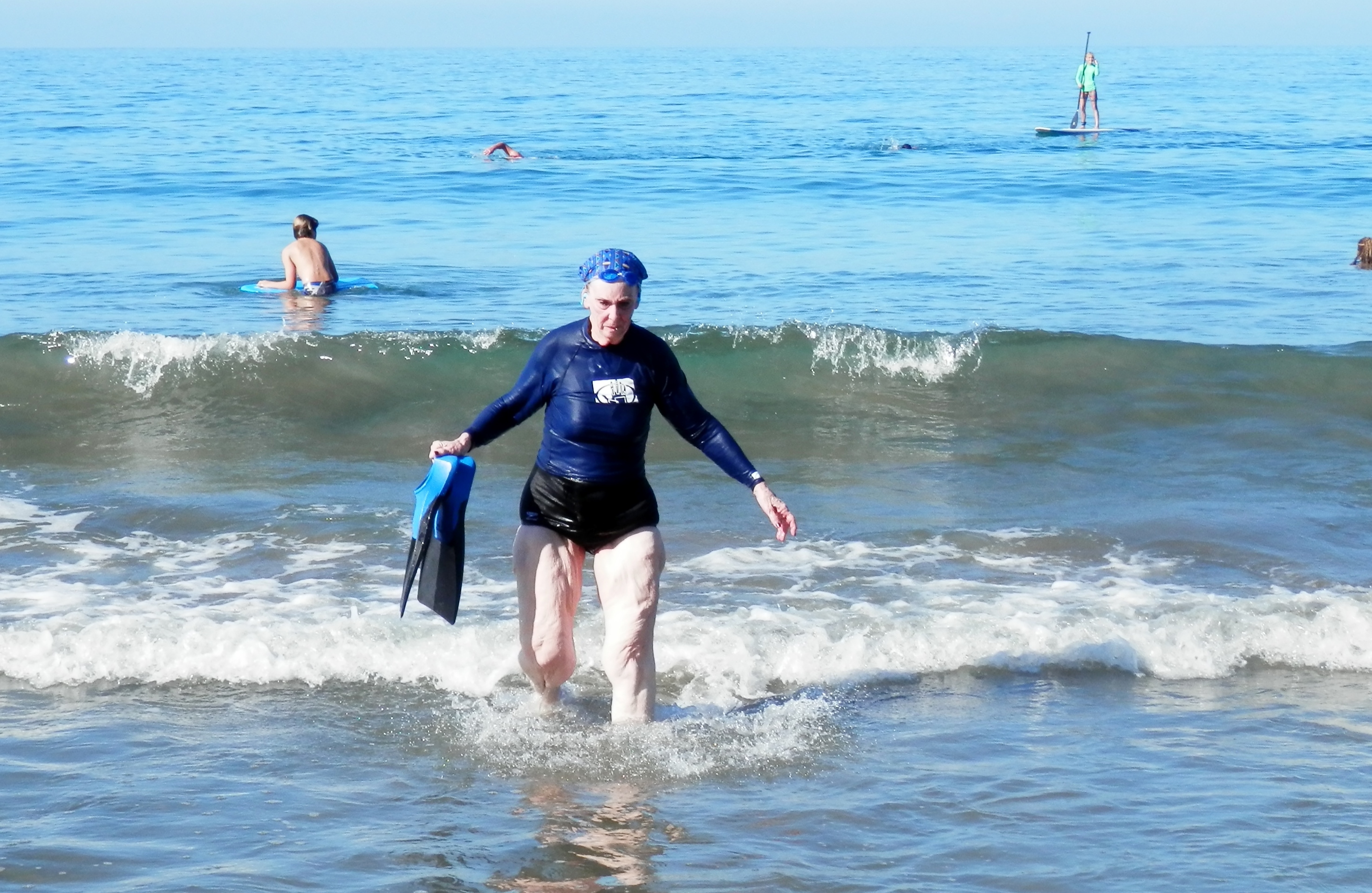 Kathleen trying to get the fins off in the surfKathleen finishing in about 50 min