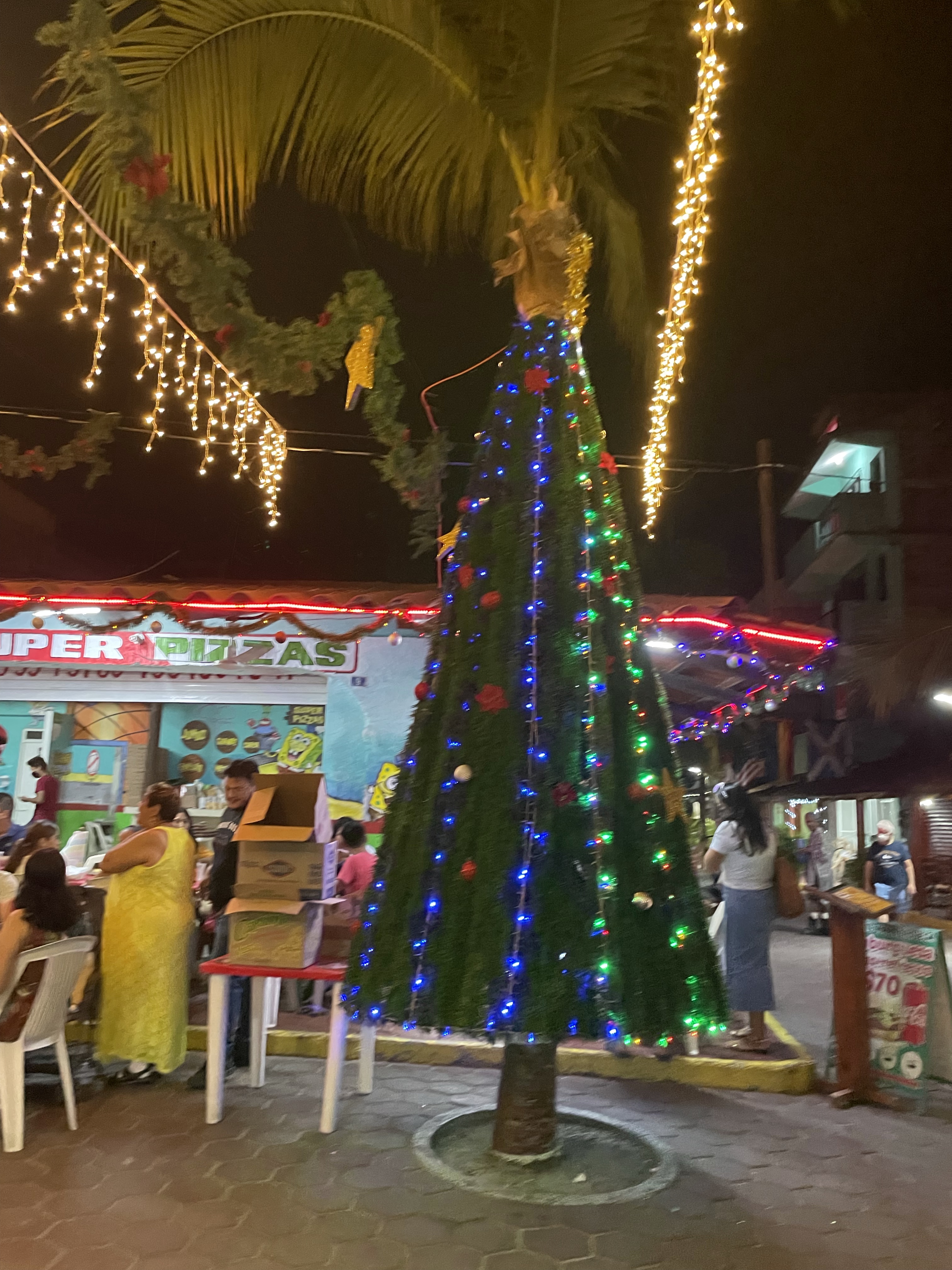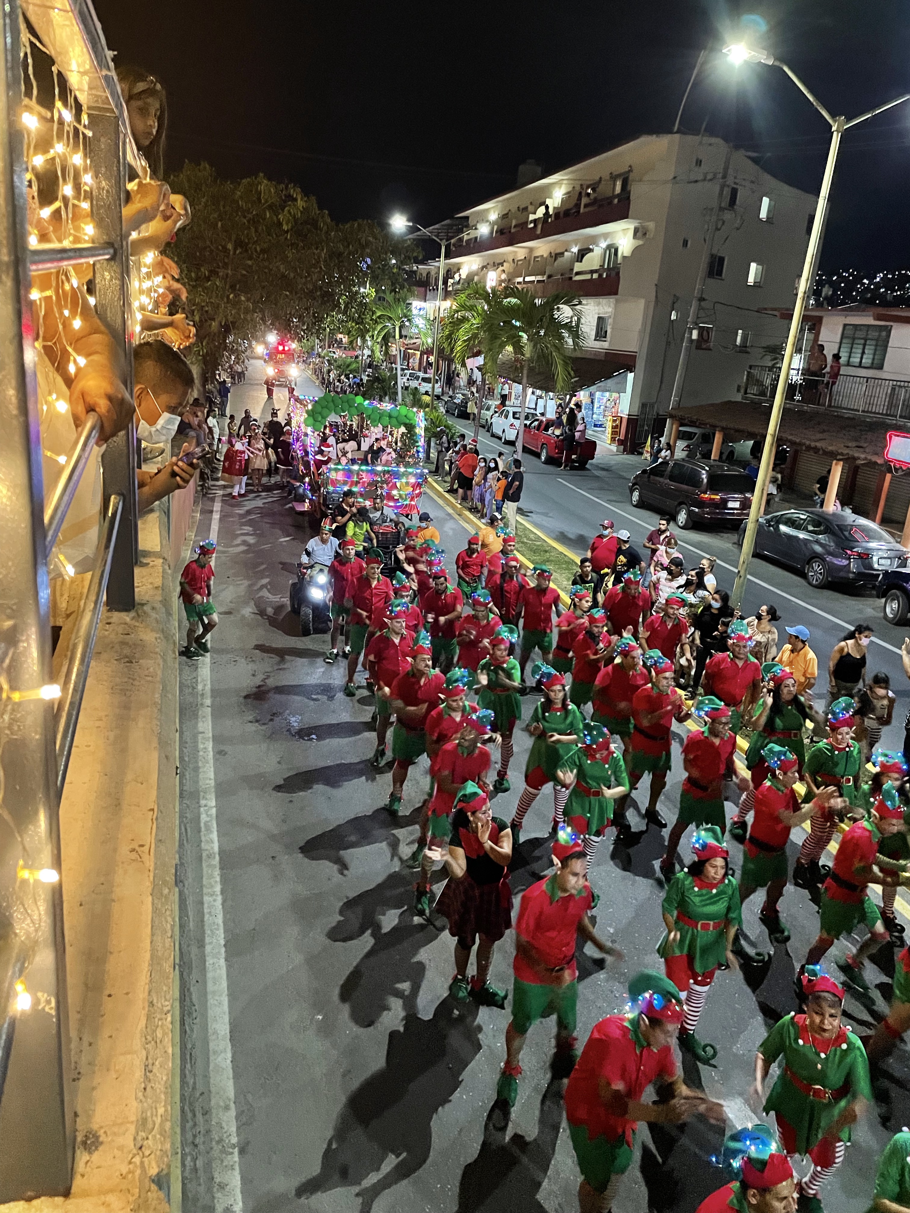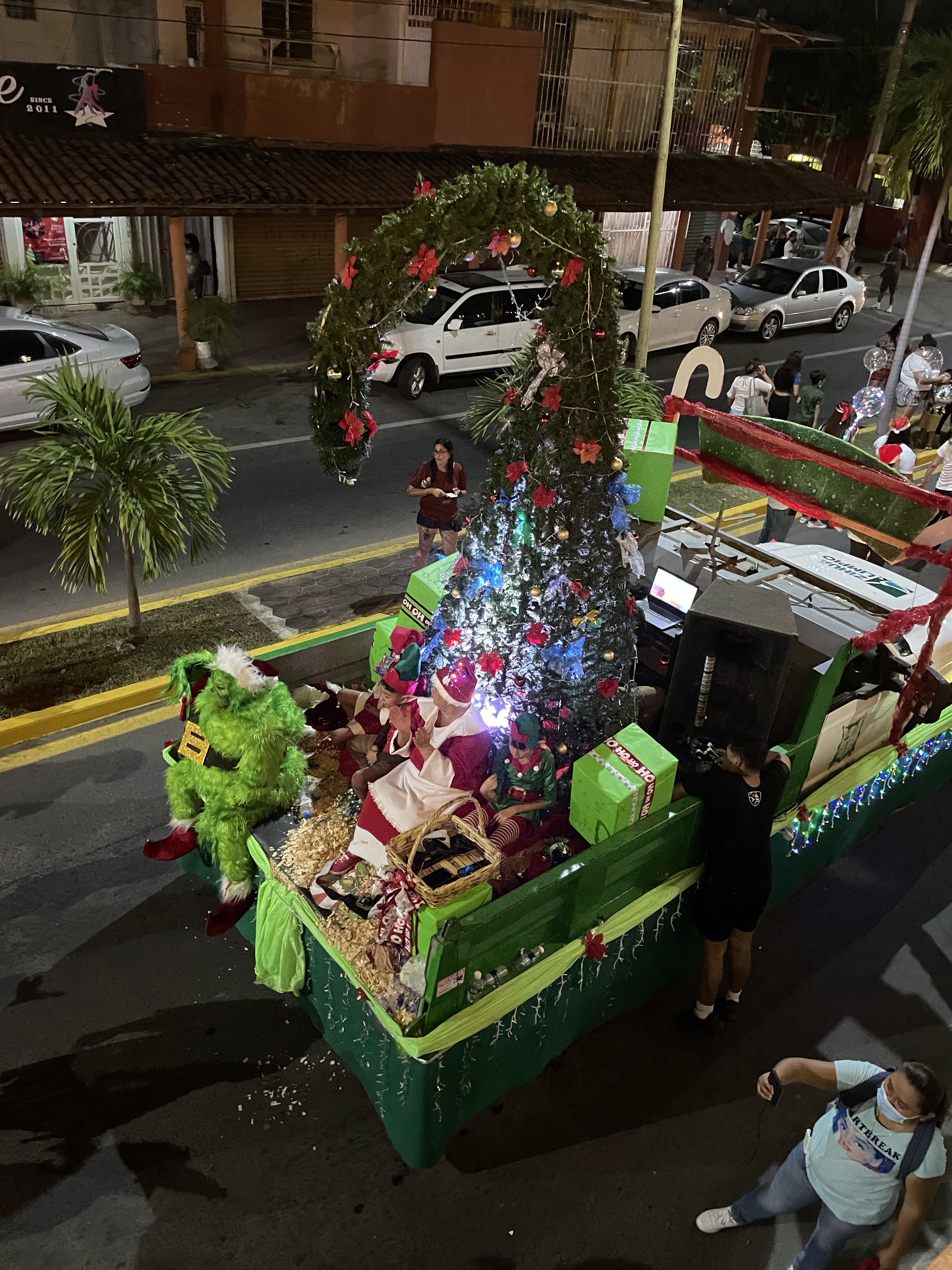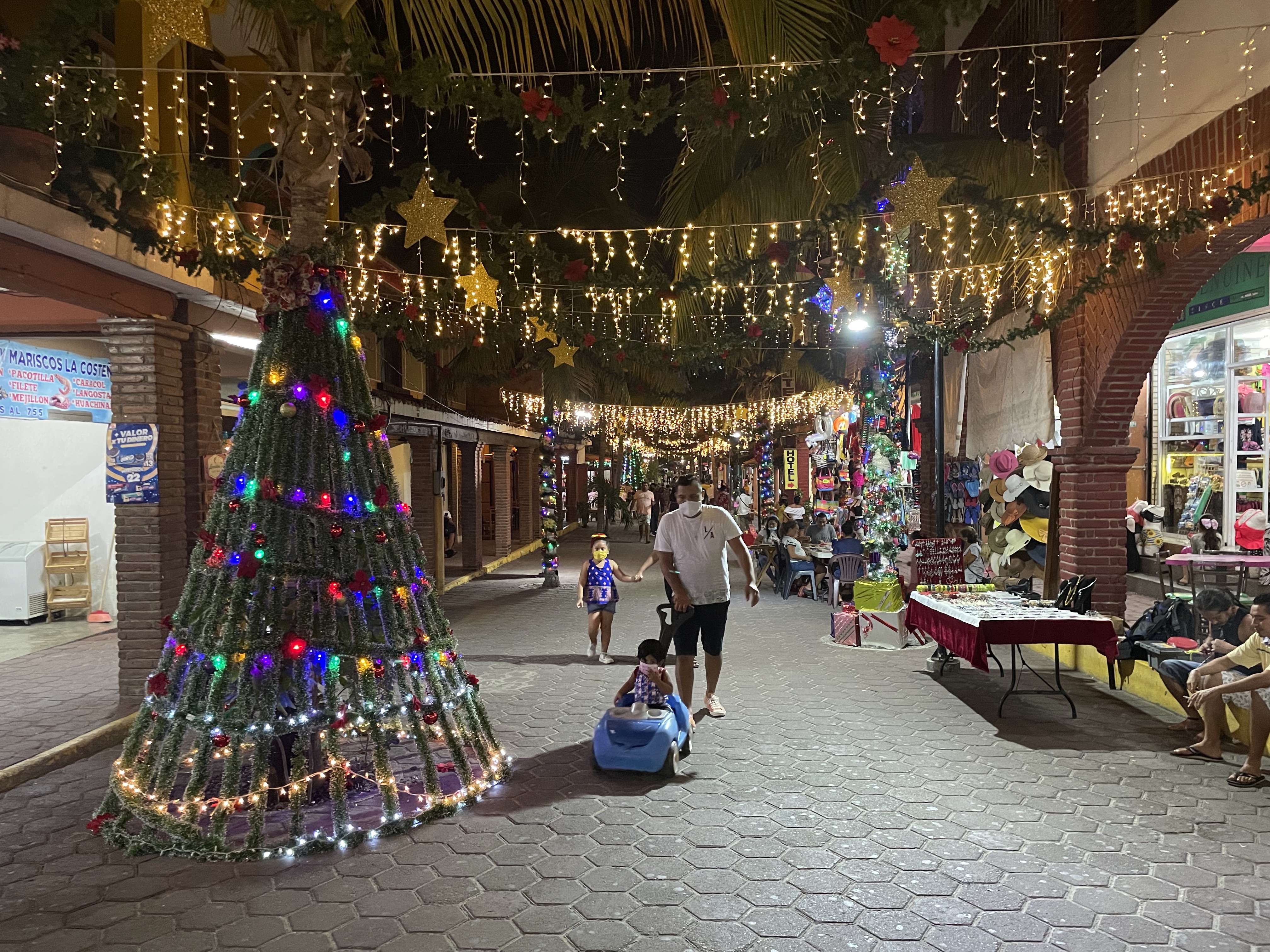 New door decorationDecorated tree along the maleconBeach front treePalm tree in disguise Festive pedestrian street.Zihuatanejo lit up for ChristmasChristmas Parade Zihuatanejo 2021Traditional dancersBridge over the canalChristmas party at Freddie’s BarFamilies watching their kids with Santa ClauseMy family that I miss.