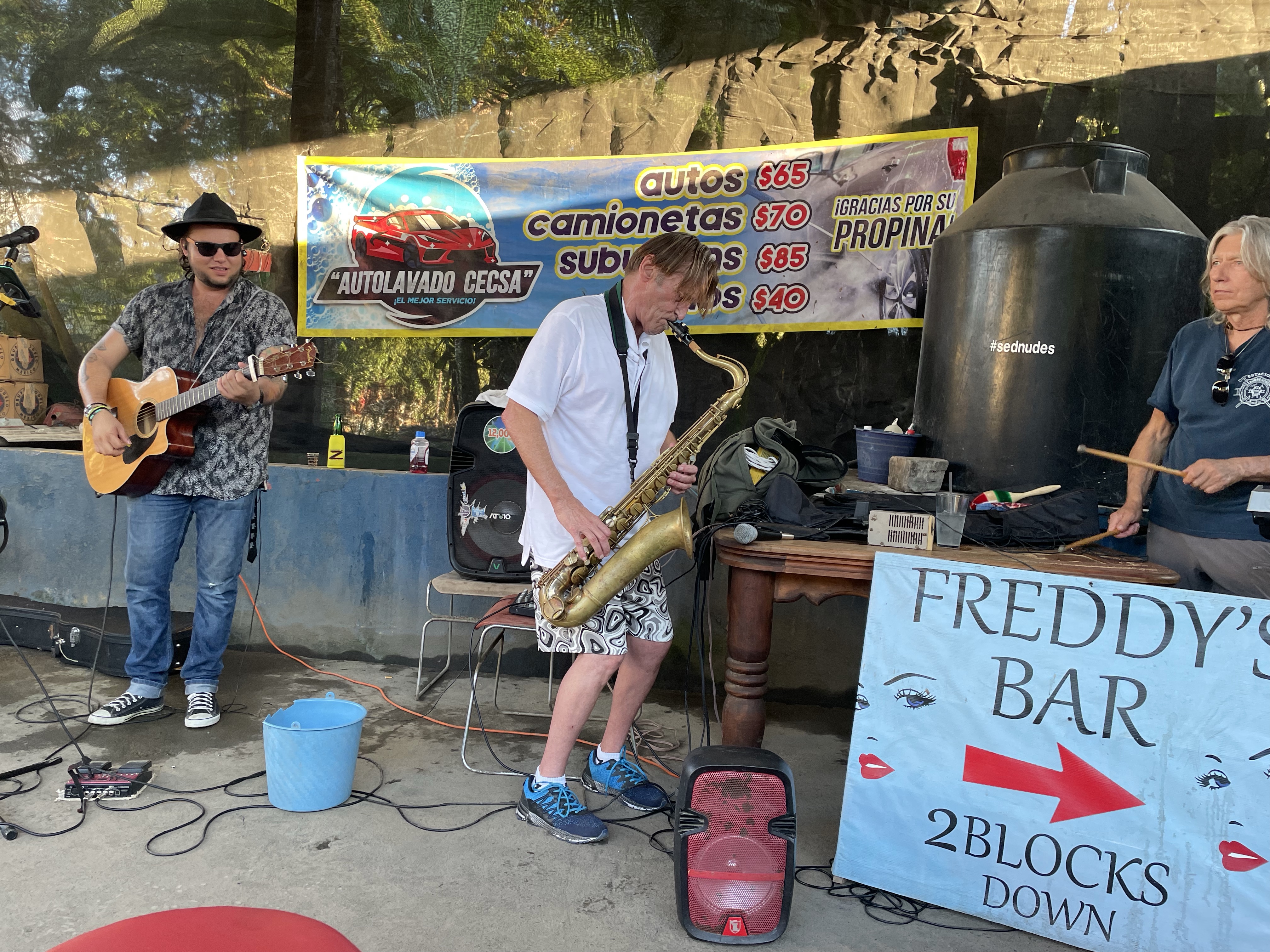 We sat and visited with friends enjoying the extremely delicious 2 for one margaritas and the 15 cent beer far too long which caused me to need to go to bed early and miss Jimmi Mamou’s birthday party at Galeana’s. But the Senor attended and other local musicians came and sang happy birthday to him and Allan sat down and played back up guitar with him.