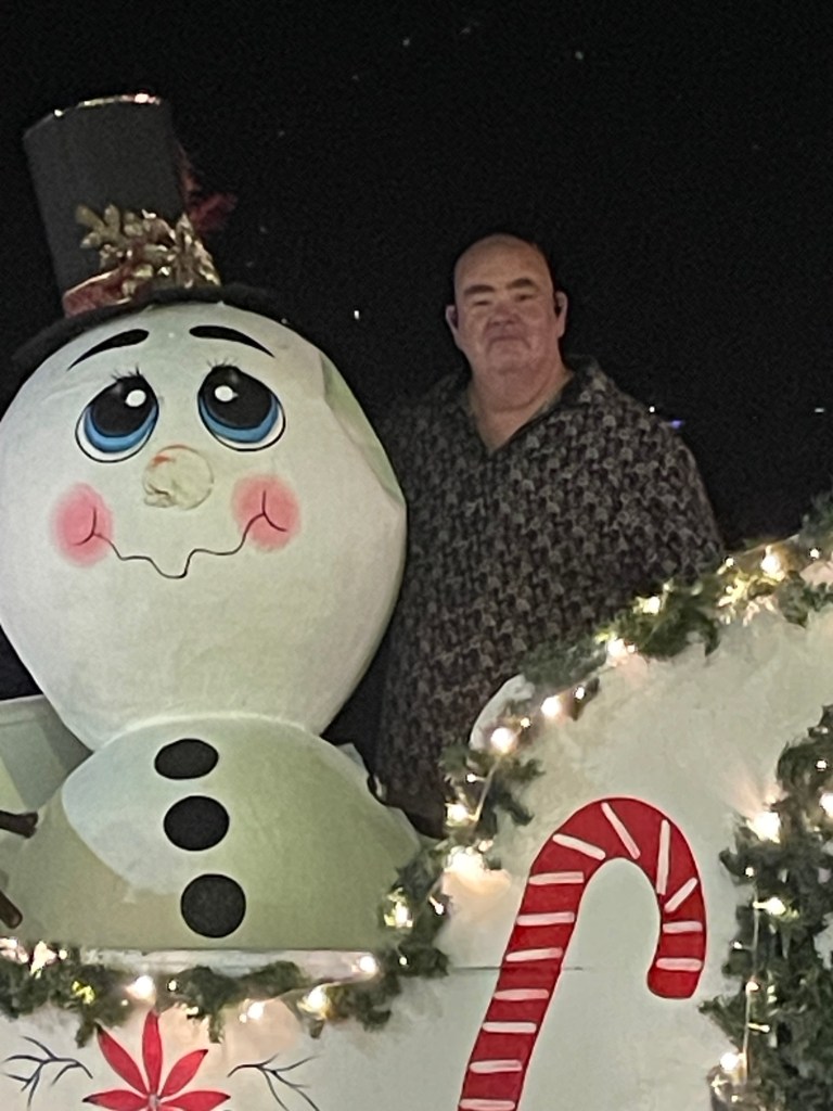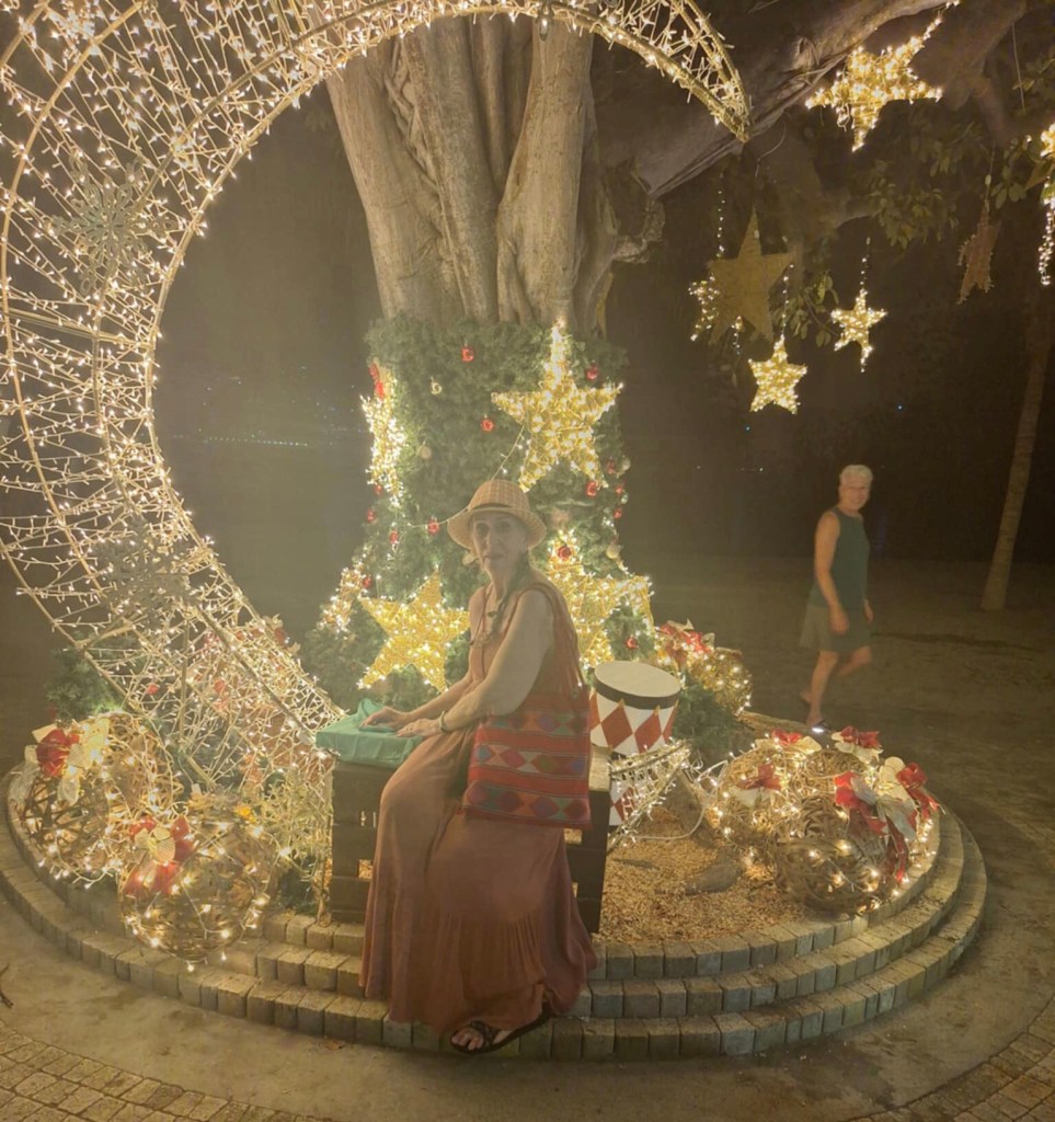 Our group of friendsWe could see some of Ixtapa’s fireworks behind the hillZihua’ s fireworksZihuatanejo so beautiful at nightMe sitting on a crescent moonThe poinsettia martSparkles decorations on the MaleconShawn and I out on the townShawn with a snowman