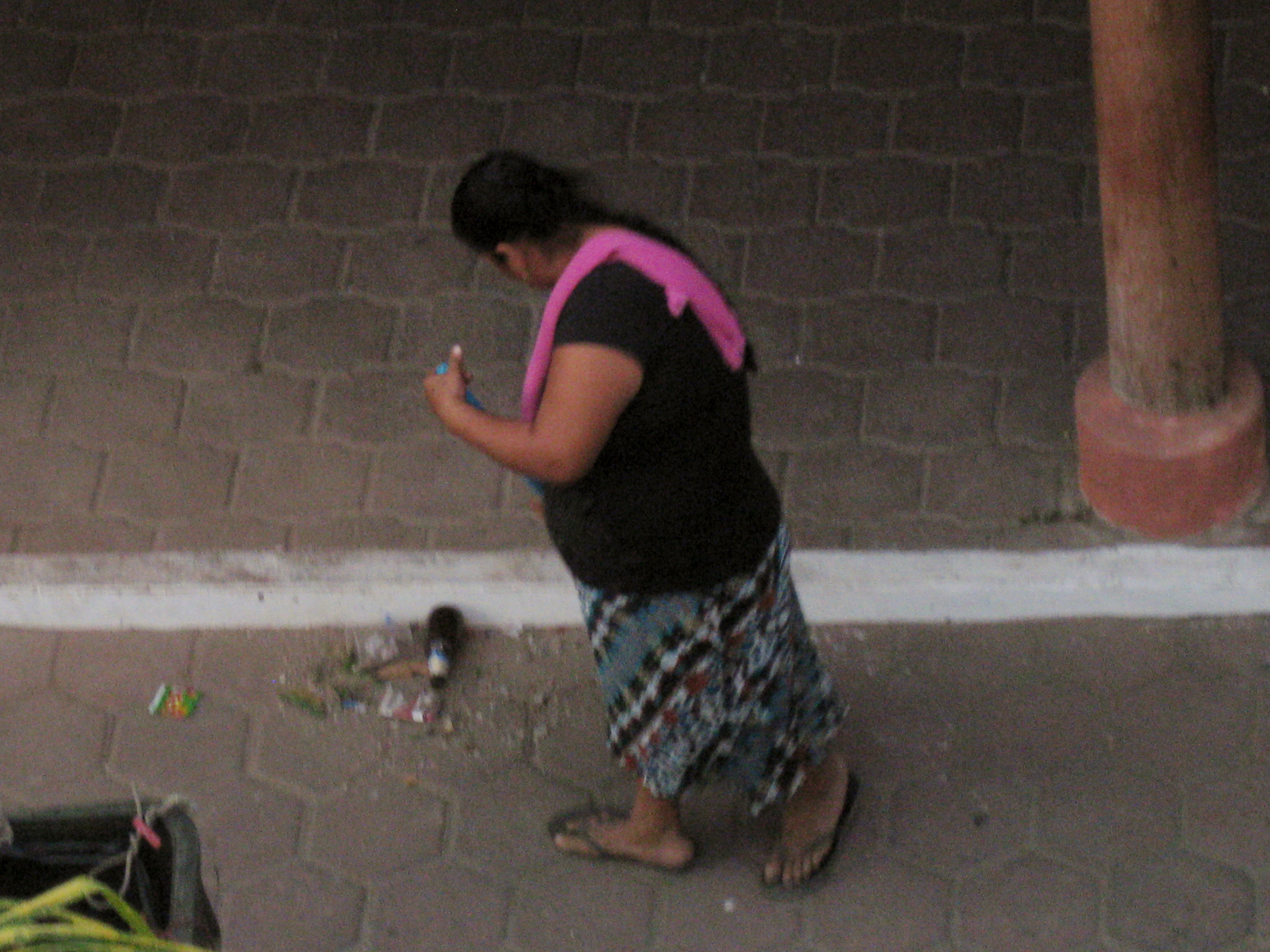 Lots of foods cooked in banana leaves, several with pick and choose ingredients, fried bananas, ice cream push carts, large variety of iced drinks dispensed from 3-4 gallon glass jugs in flavors I’ve never heard of. And people, people everywhere, young, old and in between. Groups of teenagers out checking out the social scene. Sort of like “cruzin” with out the cars. Old women gossip, babies and children wheedle parents into buying them cheap carnival toys.This happens every Sunday year round.